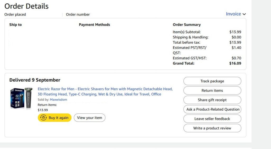 Shopping Amazon I happened upon the generically called MAXWISDOM rotary electric shaver for $13.99 CDN or $16.09 after taxes (LINK HERE if you want to see it yourself). I did not have high hopes as it had no model number, resembled most oriental shavers you could find on Aliexpress or Temu and had the usual Chinese overselling on the packaging. But I figured that since I wanted a backup razor anyway I would use it for a few weeks and if it turned out to be a dud of a product I would use the Amazon 30 day return policy and get my money back. In that event I would use the Philishave and take up my search for a backup shaver again.