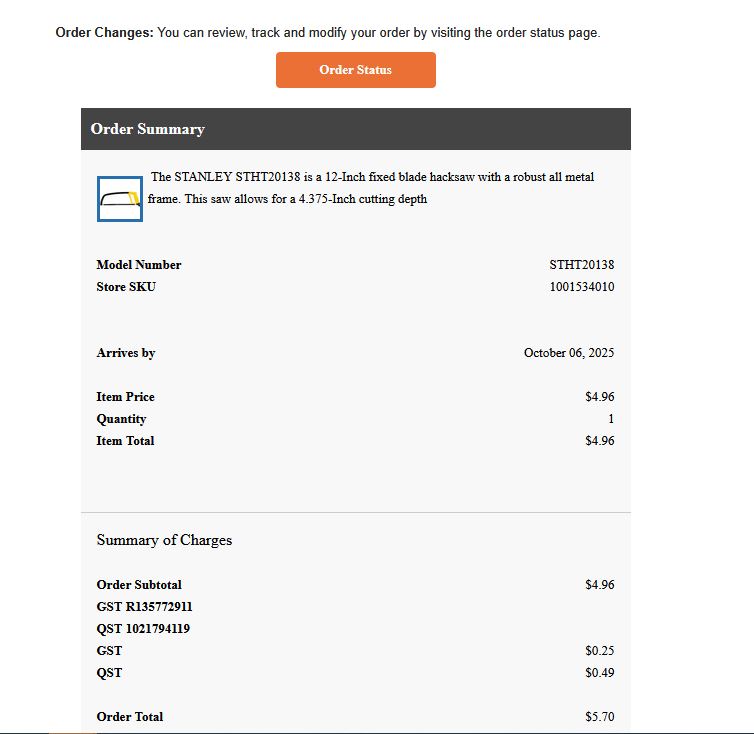 The first tool I purchased at the beginning of the month was a full sized Stanley brand hacksaw from Home Depot for $5.70 delivered. I’m not sure if they were clearing out the model or it was a sale but I couldn’t pass it up at this price.