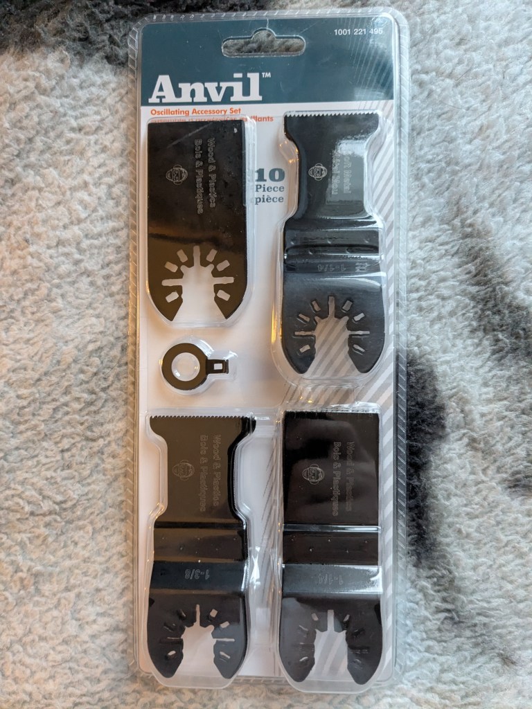The third thing I bought also from the Home Depot was 10 Anvil Oscillating blades for $11.48. These are to go with the Sonicraft power tool I bought in October at that garage sale. Anvil isn’t considered the highest quality brand but I doubt that the blades by other companies like Milwaukee/Dewalt/Mastercraft would be better enough to justify their high prices in comparison. The fact is oscillating blades get worn out fast by nature and paying top prices for blades will not change that.
