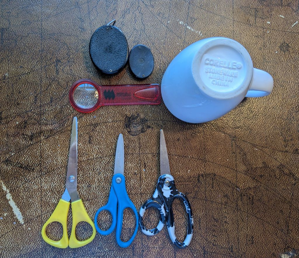 I also found a mug full of miscellaneous “school” supplies that had several pairs of scissors and 3 magnifying loops in it for $1. The loops are old but will come in handy for PCB inspection. The scissors aren’t ideal but will be used instead of pliers to cut leads until I can afford something better. The people working there threw in the mug which I am not sure was originally meant to come as a package deal but I’m not complaining. It’s Corelle branded and I will be using it as a soldering stand to hide the hot iron in case one of my cats interrupts me while I’m working.